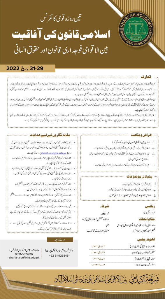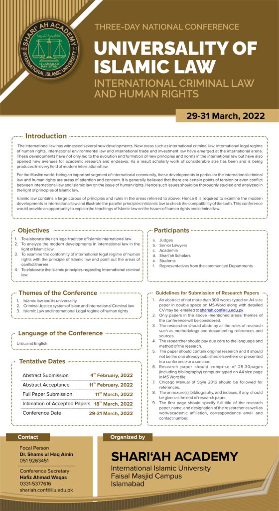 Sharī‘ah Academy is holding a Three-Day National Conference on Universality of Islamic Law (International Criminal Law & Human Rights) during 29-31 March 2022.